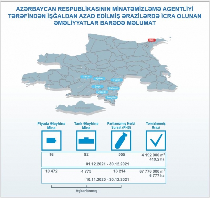 “During the mine clearing operations in Tartar, Aghdam, Fuzuli, Shusha, Gubadli, Jabrayil and Zangilan from December 1 to 30, 16 anti-personnel and 92 anti-tank mines, as well as 555 unexploded ordnances (UXO) were found and neutralized”, Azerbaijan’s Mine Action Agency said in a statement.