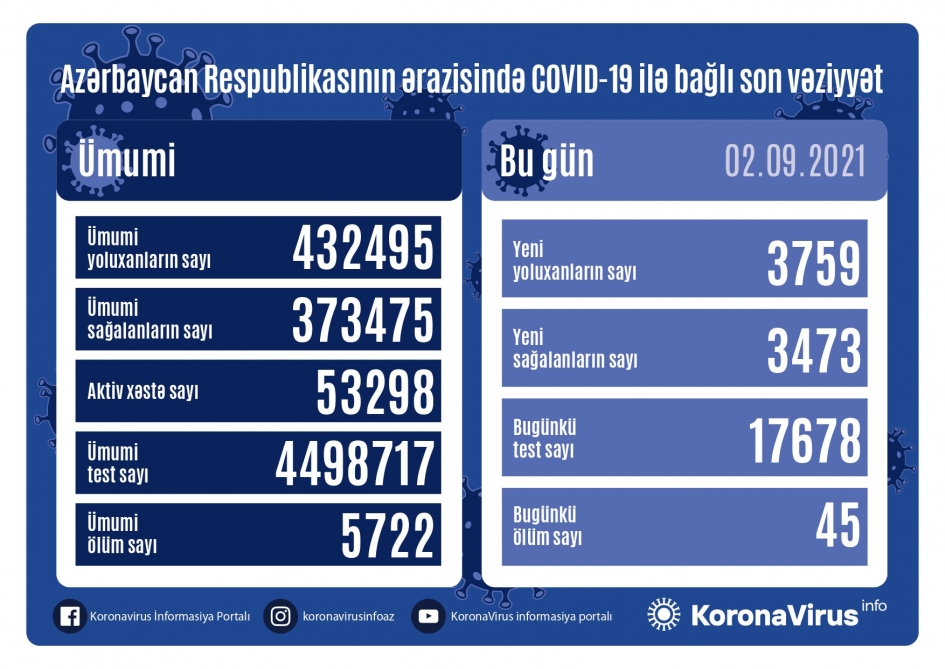 Baku, September 3, AZERTAC 3,759 new cases of coronavirus infection have been recorded in Azerbaijan, while 3,473 patients have been recovered, the Task Force under the Cabinet of Ministers told AZERTAC . According to the Task Force, 45 persons have died after testing positive for COVID-19. “The overall confirmed cases in Azerbaijan have reached 432,495 with 373,475 recoveries and 5,722 deaths, while treatment of 53,298 others is underway. “A total of 4,498,717 coronavirus tests have been conducted in the country so far,” the Task Force added.