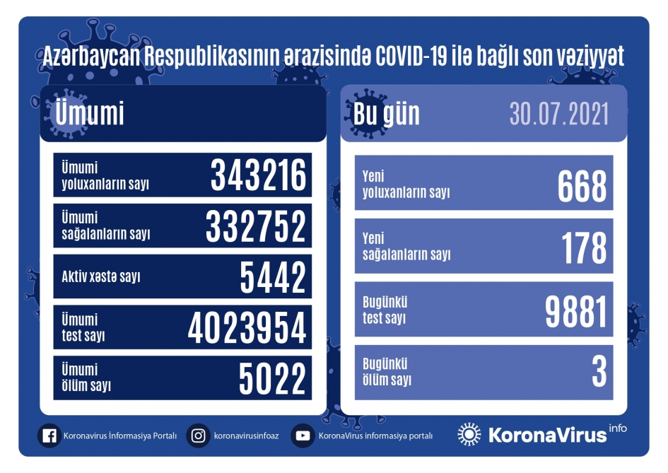 Baku, July 31, AZERTAC 668 new cases of coronavirus infection have been recorded in Azerbaijan, while 178 patients have been recovered, the Task Force under the Cabinet of Ministers told AZERTAC. According to the Task Force, 3 persons have died after testing positive for COVID-19. “The overall confirmed cases in Azerbaijan have reached 343,216, with 332,752 recoveries and 5,022 deaths, while treatment of 5,442 others is underway. A total of 4,023,954 coronavirus tests have been conducted in the country so far,” the Task Force added.