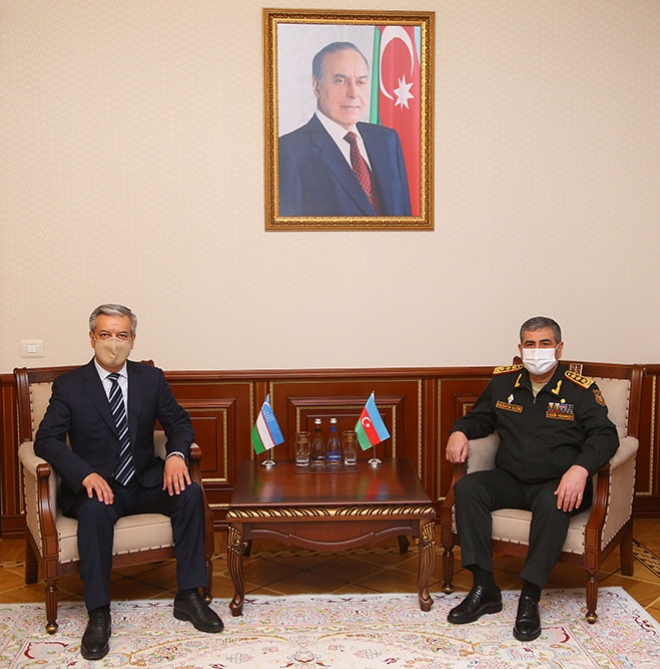 Azerbaijan`s Minister of Defense, Colonel General Zakir Hasanov has met with Uzbek Ambassador to the country Bahrom Ashrafkhanov.