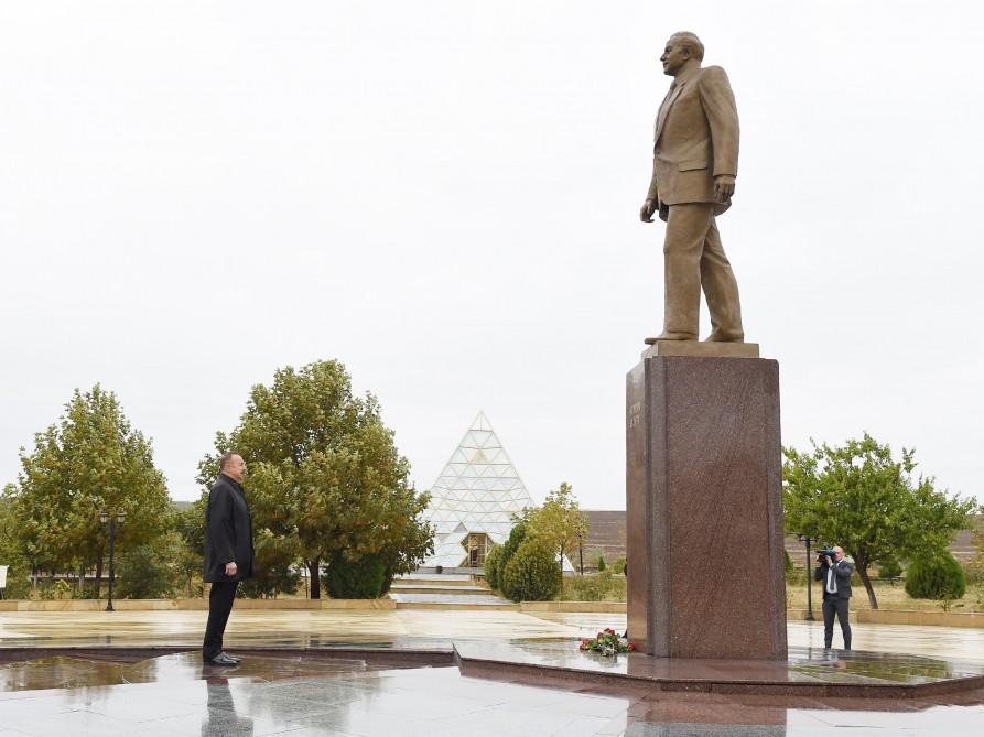 Baku, Azerbaijan, Oct. 2 Trend: President of the Republic of Azerbaijan Ilham Aliyev arrived in Gobustan district for a visit Oct. 2. The president first laid flowers at a statue of national leader in the Heydar Aliyev Park in the center of the city of Gobustan. Head of Gobustan District Executive Authority Adil Mammadov informed President Aliyev about the work carried out in the park.