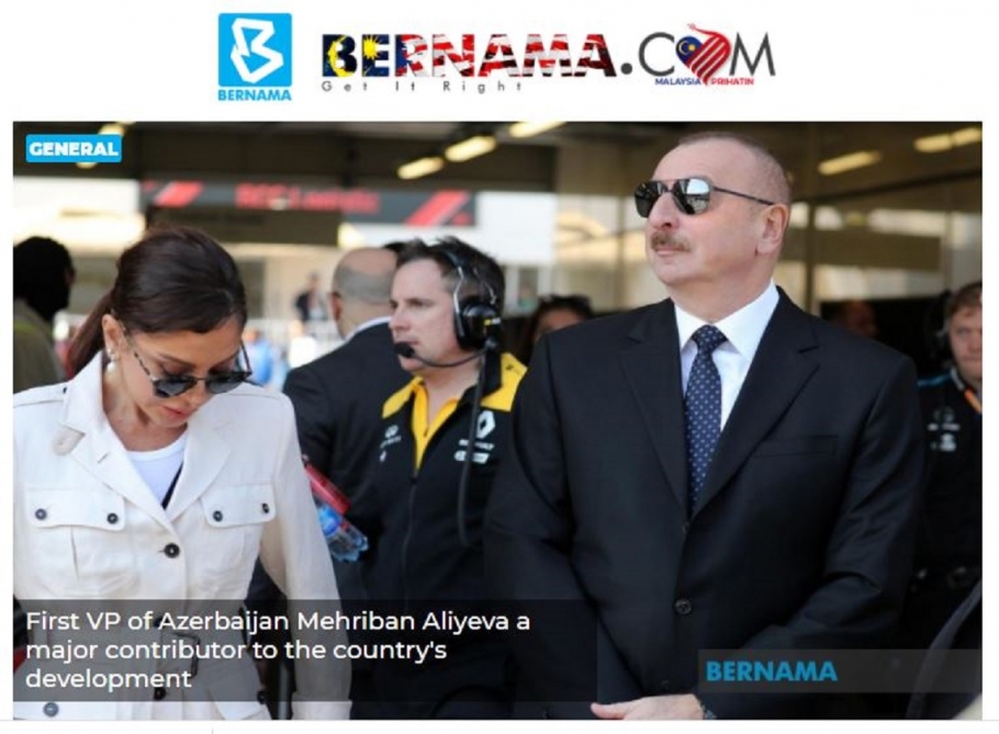 Kuala-Lumpur, September 3, AZERTAC The Malaysian Bernama news agency has published an article headlined “First Vice-President of Azerbaijan Mehriban Aliyeva a major contributor to the country's development” highlighting multifaceted activities of First Vice-President of Azerbaijan, President of the Heydar Aliyev Foundation Mehriban Aliyeva. The article, made based on AZERTAC’s “Serving Motherland and people is the life credo of First Vice-President Mehriban Aliyeva” article, says: “Direct involvement in the development of modern and independent Azerbaijan, solution for social issues, adherence to the ideas of mercy and morality, a constant desire to extend a helping hand and to do good – all these forms the backbone of the life philosophy of the First Vice-President of the Republic of Azerbaijan, President of the Heydar Aliyev Foundation, and UNESCO and ISESCO Goodwill Ambassador, Mehriban Aliyeva. Working side by side with President Ilham Aliyev, his life companion and closest ally, Mehriban Aliyeva is making a great contribution to the dynamic development of the country. Mehriban Aliyeva has successfully led the Heydar Aliyev Foundation for 16 years. The revival and expansion of the charity traditions of the Azerbaijani people became possible, thanks to the personal example of the President of the Heydar Aliyev Foundation. For 16 years, Mehriban Aliyeva has honourably carried out the responsibilities of being a UNESCO Goodwill Ambassador. Being a Goodwill Ambassador of ISESCO at the same time, she has tirelessly involved herself in activities to inform the world about the historical and cultural heritage of Azerbaijan and its realities. Mehriban Aliyeva’s appointment as the First Vice-President of Azerbaijan on February 21, 2017, is regarded as the logical outcome of her substantive activities and organisational skills. Over the past years, she has fully justified the President’s and the people’s confidence in her with the work she has carried out in this senior and responsible position. Mehriban Aliyeva’s special focus has been on finding solutions for problems facing the vulnerable segments of the population, in particular the internally displaced people (IDP). She devoted the first meeting as First Vice-President to the relocation of refugees and IDP temporarily housed in hostels in Baku and Sumgayit. On the instruction of Mehriban Aliyeva, a group of soldiers and officers who got injured in the April battles were provided with high-tech prostheses. Mehriban Aliyeva’s initiatives such as new schools for a renewing Azerbaijan, support for education, building orphanages and boarding schools, and development of preschool institutions have played an important part in improving education. With regard to public health, exceptional projects and charity programmes being implemented on Mehriban Aliyeva’s initiative such as caring for diabetic children, those affected by thalassemia and renovation and construction of medical facilities have been met with great enthusiasm. Mehriban Aliyeva has been playing an important role in the fight against the pandemic of 2020, COVID-19. She personally oversaw the treatment of those infected with the virus. With the support of the Heydar Aliyev Foundation and Mehriban Aliyeva, modular hospitals were built for patients with coronavirus and numerous medical supplies were delivered from foreign countries for treatment. On Mehriban Aliyeva’s initiative, consistent and focused work is underway to communicate the truth about the Armenia-Azerbaijan Nagorno-Karabakh conflict, the culture, history and traditions of statehood to the international community. Exhibitions, days of culture and other events are being organised in reputable international organisations and various countries around the world. The multifaceted charity activities of Mehriban Aliyeva are highly appreciated both in Azerbaijan and internationally. The Heydar Aliyev Order, the highest award of the Azerbaijani state, the highest order of the European Olympic Committees, the Order of the Legion of Honor of France, Knight Grand Cross of the Order of Merit of Italy, Grand Commander's Cross of the Order of Merit of Poland, the Order of Friendship of Russia, UNESCO Golden Mozart Medal are just a few of the awards and titles bestowed on the First Vice-President of Azerbaijan.”