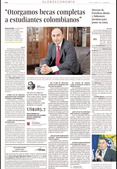 Colombia’s leading “La Republica” newspaper has published an interview with Azerbaijani ambassador to the country Mammad Talibov, highlighting Azerbaijan’s 44-day Patriotic War, as well as the current geopolitical situation in the South Caucasus region, large-scale economic projects between Azerbaijan and Latin America, including bilateral Azerbaijan-Colombia relations.