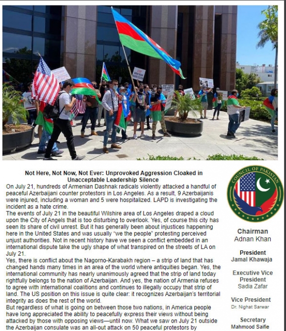The influential Council of Pakistan, based in Los Angeles, has issued a statement condemning the violence committed by Armenian Dashnaks against Azerbaijani-American community members in Los Angeles on July 21, 2020.