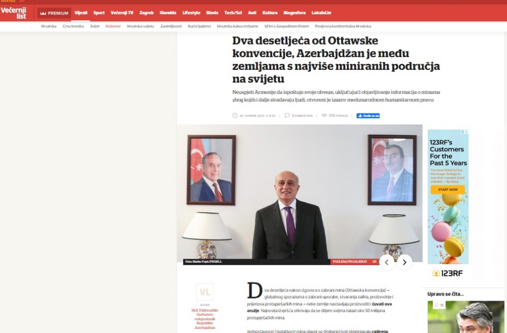 On the eve of the “18th International Symposium - Mine Action” in Croatia, the country's influential “Večernji list” newspaper has published an article headlined "Two decades after the Ottawa Convention - Azerbaijan, one of the most mined countries in the world."
