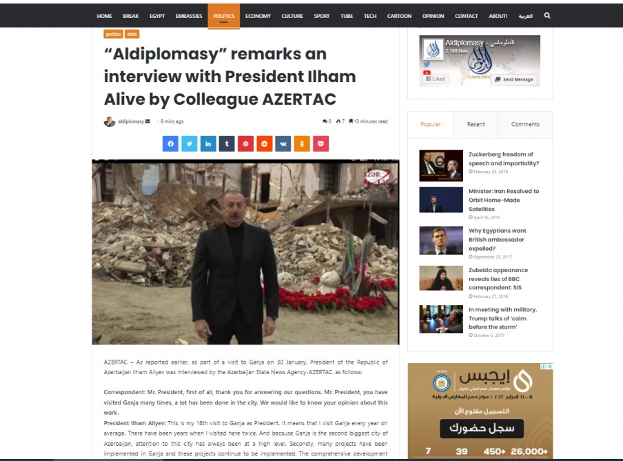 Egyptian Aldiplomasy news portal posts President Ilham Aliyev’s interview with AZERTAC