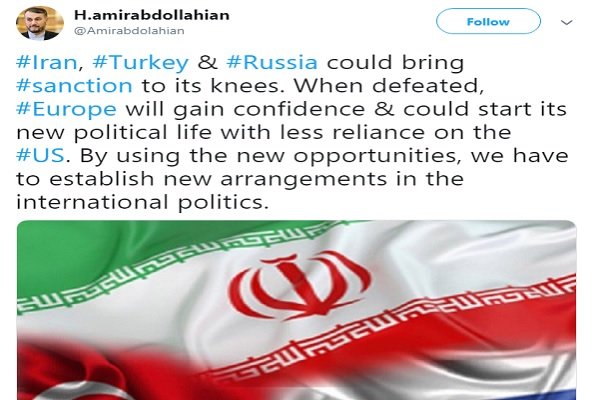 Iranian Parliament Speaker Special Aide on International Affairs Hossein Amir-Abdollahian has said in a tweet that “Iran, Turkey, Russia can bring sanctions to its knees” and can teach Europe to not rely on the United States and pursue an independent foreign policy.