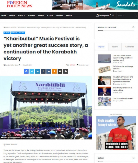 The US-based Foreign Policy News has published an article by Chairman of the Board of AZERTAC, OANA Vice-President Aslan Aslanov highlighting the “Kharibulbul” music festival held in the liberated from Armenian occupation Shusha city.