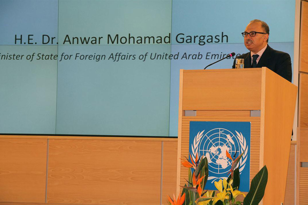 Geneva: Dr. Anwar Mohammed Gargash Minister of State for Foreign Affairs and Minister of State for Federal National Council Affairs yesterday delivered the statement of the UAE to the High Level Segment of the 25th session of the United Nations Human Rights Council in Geneva.