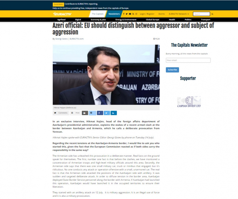 In an exclusive interview with EURACTIV portal, Assistant to the President of Azerbaijan, head of Foreign Policy Affairs Department of the Presidential Administration Hikmat Hajiyev explained the stakes of a recent armed clash at the border between Azerbaijan and Armenia, which he called a deliberate provocation from Yerevan.