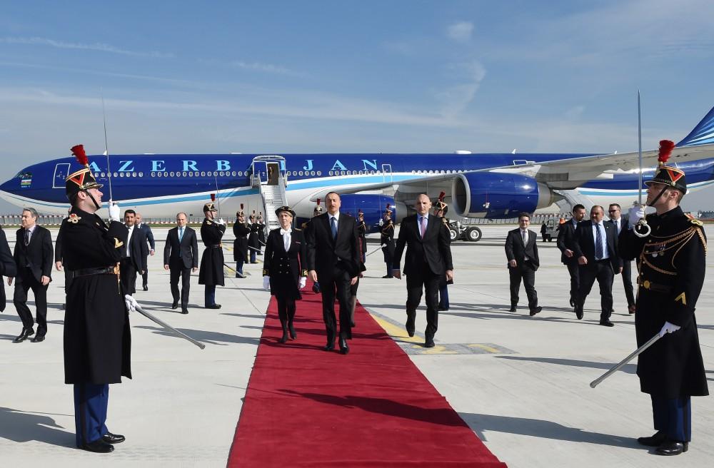 Baku, Azerbaijan, March 12 Trend: President of the Republic of Azerbaijan Ilham Aliyev has today arrived in the French Republic for an official visit. A ceremonial guard of honor was lined up for the head of state at Paris Orly International Airport, which was decorated with the national flags of Azerbaijan and France. President of Azerbaijan Ilham Aliyev was welcomed by high-ranking officials of France.