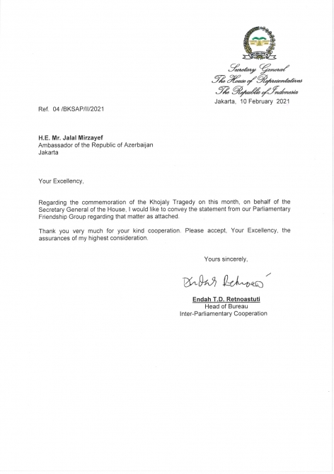 Baku, February 17, AZERTAC The Indonesia-Azerbaijan Inter-Parliamentary Friendship Group at the House of Representatives of the Republic of Indonesia has issued a statement on the occasion of the 29th anniversary of the Khojaly massacre. Signed on behalf of the members of the inter-parliamentary friendship group by Head of Indonesia - Azerbaijan Parliamentary Friendship Group, Member of the House of Representatives of the Republic of Indonesia Muhammad Iqbal, the statement reads: “ On the night of February 25 to 26, 1992, the civilian population in the Azerbaijani town of Khojaly was subjected to massacre. As many as 613 people, including 106 women, 63 children and 70 old people were killed, hundreds of people were severely injured and 1,275 people were taken hostage as a result of the massacre. The group is of the view that the Khojaly massacre as a big stain in the history of humanity, stressing that those who are responsible for Khojaly massacre should be brought to justice. With deep sorrow and sympathy, the group pays tribute to the memory of the victims of the Khojaly massacre committed in Azerbaijan‘s Nagorno-Karabakh region 29 years ago as it was the darkest chapter in the Armenia-Azerbaijan conflict. The group wishes God’s mercy upon those who lost their lives in that massacre and extends its condolences to the bereaved families and all Azerbaijani people. The group further deems it is essential to commemorate those who lost their lives in Khojaly and remember the horrible crimes committed in Khojaly so that such crimes against humanity will no longer occur in any part of the world. The group also regards that the victims of Khojaly remind everyone of the value of peace. The 29th anniversary of the Khojaly massacre should be seized as an opportunity to launch a fresh international peace effort to resolve the Armenia-Azerbaijan Nagorno-Karabakh conflict with urging from Armenia to comply with the UN Security Council Resolutions 822, 853, 874 and 884 which call for the withdrawal of Armenian troops from the occupied territories of Azerbaijan and for the return of the one million Azerbaijani refugees back to their homes.”