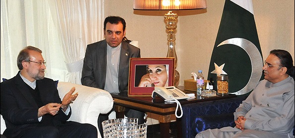 TEHRAN,Feb.14(MNA) – Iranian Majlis Speaker Ali Larijani, on the last day of his three-day visit to Pakistan, met with Pakistani President Asif Ali Zardari in Lahore on Wednesday and discussed various issues with him. Larijani visited Pakistan to attend the first conference of parliamentary assembly of the Economic Cooperation Organization (ECO) countries in Islamabad that were held on Monday and Tuesday. In his meeting with Zardari, a number of Pakistani parliament members, Chairman of Pakistan People’s Party (PPP) Bilawal Bhutto Zardari, and Pakistani Oil Minister Asim Hussain were also present. The two sides held talks on ways to expand economic, political, and parliamentary relations between the two countries. They also emphasized the need for the completion of Iran-Pakistan gas pipeline and power transmission line projects. Larijani hailed the initiative by Pakistani Speaker of the National Assembly Fahmida Mirza to host the parliamentary assembly of the ECO countries. President Zardari, praising Iran for its participation in the forum, said that he was “impatiently” waiting to visit Iran and meet the Supreme Leader of the Islamic Revolution.