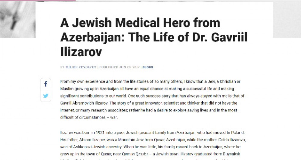 Headlined "Jewish Medical Hero from Azerbaijan: The Life of Dr. Gavriil Ilizarov", the article says: "From my own experience and from the life stories of so many others, I know that a Jew, a Christian or Muslim growing up in Azerbaijan all have an equal chance at making a successful life and making significant contributions to our world. One such success story that has always stayed with me is that of Gavriil Abramovich Ilizarov. The story of a great innovator, scientist and thinker that did not have the internet, or many research associates; rather he had a desire to explore saving lives and in the most difficult of circumstances – war."