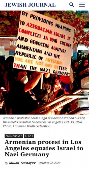 In the article, the author mentions that the Armenian Youth Federation – a youth wing of the Armenian Revolutionary Federation – staged last week a protest against Israel for supporting Azerbaijan in front of the Israeli Consulate in Los Angeles, and that on one of the posters at the protest it was written: “You are not any better than the Nazi Germany”.