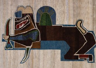 His rugs explore designs he culled from the tribal and nomadic arts and culture of Iran. In addition, love, poets, lions, birds and cages are the central themes of his works in this collection.