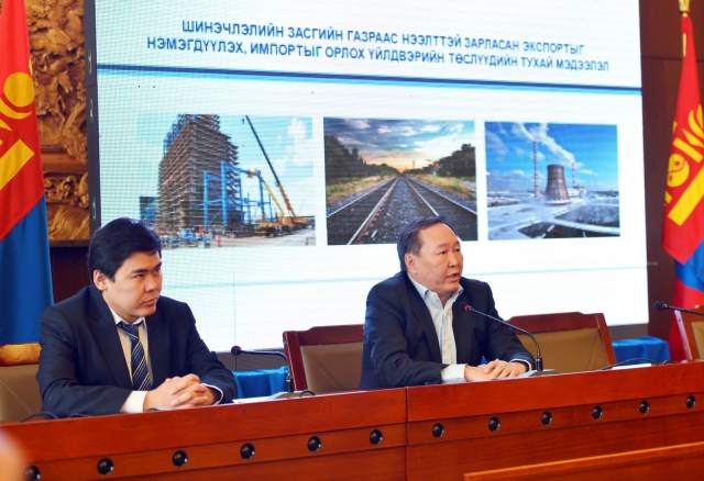 Ulaanbaatar /MONTSAME/ The Minister of Economic Development N.Batbayar gave a report at the “Hours of great construction” weekly meeting on a course of the cabinet’s measure of accepting projects on increasing export and import substitution industrialization (ISI). The cabinet has received 1,151 projects so far, and 59 projects of them are duplicated in terms of contents, and two of them are too expensive to realize. Moreover, 200 projects do not meet the key purpose, so 888 projects fully satisfy the conditions for supporting the export and ISI, the Minister said. The most expensive project requires MNT 285 billion, whereas the cheapest project costs MNT 5 million, he noted. The projects on the export accepted by the cabinet can be divided into seven sectors--processing of minerals, heavy industry, processing of livestock raw materials, food industry, light industry and construction material production. Majority of the projects on the ISI involve the sectors of construction material productions, food industry, light and heavy industries, the Minister said, adding that it has been project 40 thousand job places will be created if these projects are realized. Regarding the credit terms of the project, the Minister reported that a loan will be given in Mongolian togrog (MNT). The loan period will be five years, and interest rate will be less than 9%, he said.