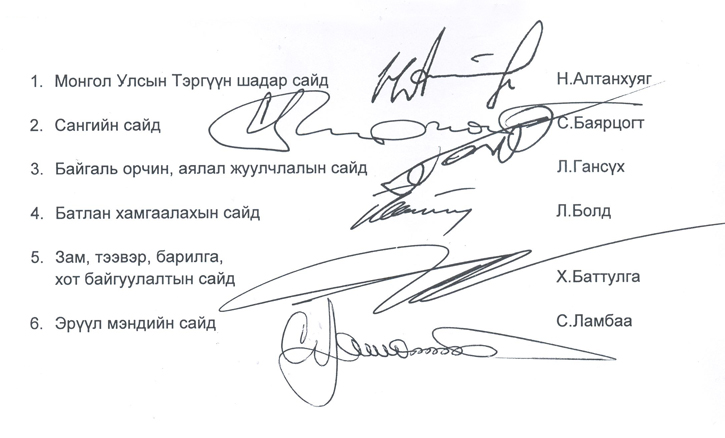 The letter of request has been signed by N.Altankhuyag, the First Deputy Premier; S.Bayartsogt, the Minister of Finance; L.Gansukh, the Minister of Environment and Tourism; L.Bold, the Minister of Defense; Kh.Battulga, the Minister of Road, Transportation, Construction and Urban Development; and by S.Lambaa, the Minister of Health.