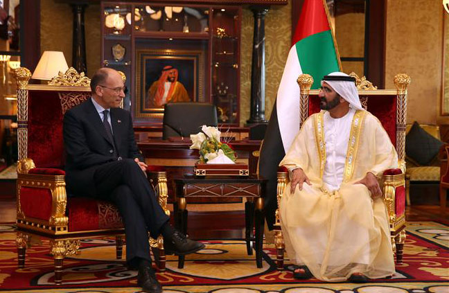 Dubai (WAM): Vice President and Prime Minister and Ruler of Dubai, His Highness Sheikh Mohammed bin Rashid Al Maktoum, received yesterday the Prime Minister of Italy, Enrico Letta and his accompanying delegation, at his Palace in Zabeel Present at the meeting was H.H. Sheikh Hamdan bin Mohammed bin Rashid Al Maktoum, Crown Prince of Dubai. Sheikh Mohammed and Mr. Letta exchanged talks on a number of mutual and regional issues in the presence of H.H. Sheikh Maktoum bin Mohammed bin Rashid Al Maktoum, Deputy Ruler of Dubai and H.H. Sheikh Mansour bin Zayed Al Nahyan, Deputy Prime Minister and Minister of Presidential Affairs. During the meeting, the two sides focussed on ways to enhance cooperation relations in trade, investment and other fields of mutual interest, such as customs and privatisation between the two countries. Sheikh Mohammed affirmed that the UAE is always working on opening up new channels with various friendly countries in order to discuss cooperation possibilities in various fields, especially issues which would benefit the UAE, its people and these countries. The Vice President welcomed the Italian Prime Minister's visit to the UAE, saying, "This is a friendship visit, which will open up broader horizons to discover new domains so as to build economic and investment." The Italian Prime Minister praised the cultural boom being witnessed by the UAE in all avenues, expressing the desires of the Italian Government, its people and the private sector to expand cooperation and partnership fields with the UAE, especially as Italy has a privatisation programme which would avail new investment opportunities. He also invited Emirati investors to build partnerships with Italian businesspersons and companies. He pointed out that 300 Italian companies are operating in the UAE in various fields. He also hailed the humanitarian stance of the UAE leadership, government and people, highlighting the aid provided by the UAE for various peoples all over the world, which are prone to natural catastrophes, wars or diseases. – Emirates News Agency, WAM