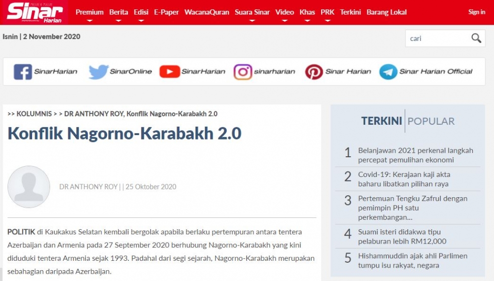 Kuala Lumpur, November 3, AZERTAC Malaysian “Sinar Harian” daily newspaper has published an article highlighting the Armenia-Azerbaijan Nagorno-Karabakh conflict. Written by Dr. Roy Anthony Rogers from University of Malaya, the article provides an insight into Armenia`s latest military provocation against Azerbaijan. It says that despite several agreements reached since 1992 by the OSCE Minsk Group, no visible progress has been achieved. The article notes Azerbaijan`s commitment to the Minsk Group negotiation process, saying Armenia, on the contrary, has been uninterested in the conflict settlement. Dr. Rogers emphasizes that the Armenian armed forces are targeting the civilian population of Azerbaijan, saying many civilians were killed in missile attacks on Ganja and other cities far from the conflict zone. Vugar Aghayev Special Correspondent