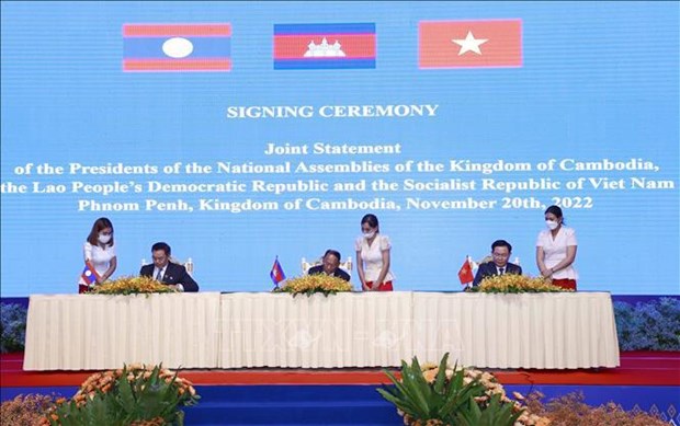 Phnom Penh, November 22 (VNA) – The leaders of the National Assemblies of Vietnam, Cambodia and Laos signed a joint statement on establishing their summit mechanism in Phnom Penh on November 20, in the framework of the 43rd General Assembly of the ASEAN Inter-Parliamentary Assembly (AIPA-43).