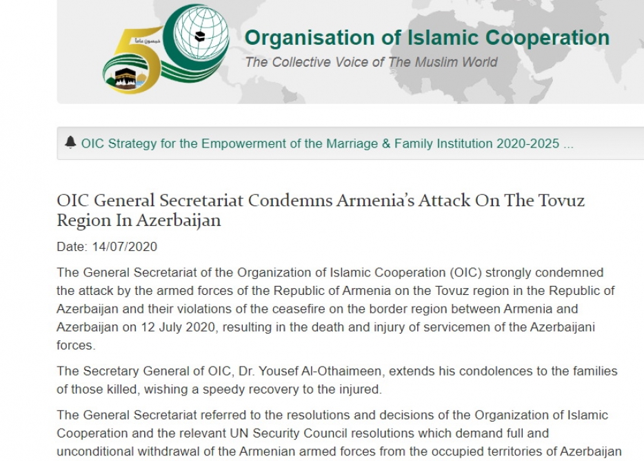 The General Secretariat of the Organization of Islamic Cooperation (OIC) has made a statement strongly condemning the attack by the armed forces of Armenia on Tovuz region in Azerbaijan and their violations of the ceasefire on the border region between Armenia and Azerbaijan on 12 July 2020, resulting in the death and injury of servicemen of the Azerbaijani forces.