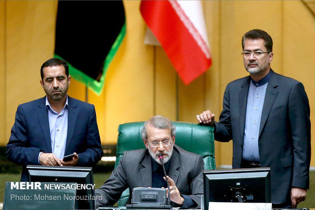 Parliament's open session on Sunday morning was attended by Parliament Speaker Ali Larijani, Acting Minister of Economic Affairs and Finance Seyyed Rahmatollah Akrami, Foreign Minister Mohammad Javad Zarif, Intelligence Minister Seyyed Mahmoud Alavi, Governor of Central Bank of Iran (CBI) Abdolnaser Hemmati, Vice-President for Legal Affairs Laya Joneydi, Deputy Foreign Minister for Political Affairs Abbas Araghchi and Spokesman for the Atomic Energy Organization of Iran (AEOI) Behrouz Kamalvandi.
