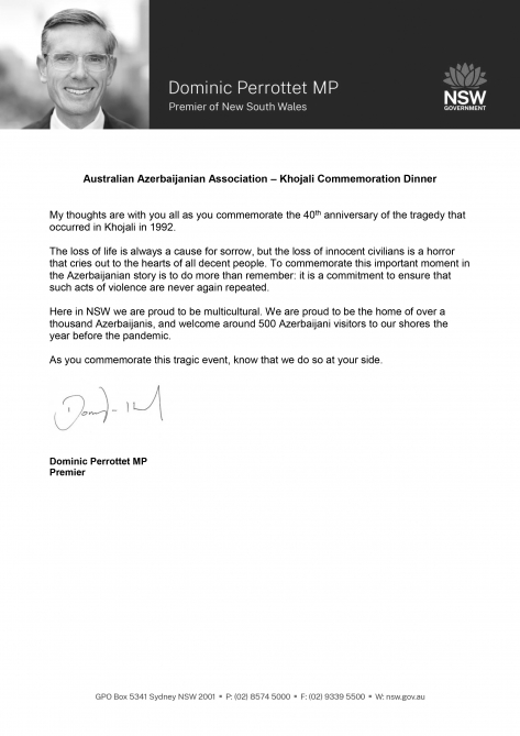 Canberra, February 28, AZERTAC Premier of New South Wales of Australia Dominic Perrottet has sent a letter of solidarity to the Azerbaijani community on the 30th anniversary of the Khojaly genocide. The letter says: “My thoughts are with you all as you commemorate the 30th anniversary of the tragedy that occurred in Khojaly in 1992. The loss of life is always a cause for sorrow, but the loss of innocent civilians is a horror that cries out to the hearts of all decent people. To commemorate this important moment in the Azerbaijani story is to do more than remember: it is a commitment to ensure that such acts of violence are never again repeated. Here in NSW we are proud to be multicultural. We are proud to be the home of over a thousand Azerbaijanis, and welcome around 500 Azerbaijani visitors to our shores the year before the pandemic. As you commemorate this tragic event, know that we do so at your side.”