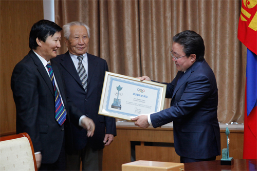 On Monday, the president of Mongolia's National Olympic Committee (MoNNOC) D.Zagdsuren, and a honorary member of the IOC Sh.Magvan handed over to the State Head the Cup and Diploma sent from the IOC president Mr Jacques Rogge. "This prize is awarded to a political figure who significantly contributed to sports," Mr Magvan said, expressing satisfaction with presenting the prize to Mr Elbegdorj.
