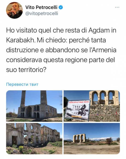 President of the Committee on Foreign Affairs and Emigration of the Italian Senate Vito Petrocelli has made a post on his Twitter account on his visit to Azerbaijan’s liberated city of Aghdam.