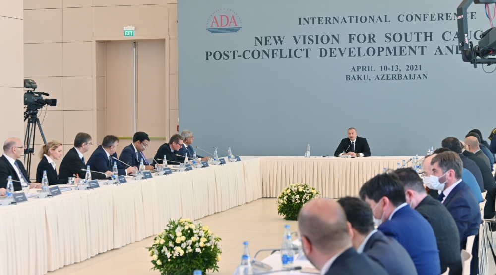 Baku, April 13, AZERTAC Probably you know that foreigners who were illegally visiting then Nagorno-Karabakh were deprived of visiting the territories which you have visited. They were deprived of going to Aghdam, to Fuzuli, to other territories which surrounded the former Nagorno-Karabakh administrative district. Because Armenian government didn’t want foreigners to see the devastation and to see their hatred to Azerbaijanis, because it’s clear that those destructions and devastations were done after the first Karabakh war stopped. Because it’s not possible to destroy the citizen villages during the war,” said President Ilham Aliyev as he made a speech at the “New vision for South Caucasus: Post-conflict development and cooperation” conference held at ADA University. “They did it deliberately in order to erase the legacy of Azerbaijani culture in order to erase these territories from our memories, in order to change the origin of those lands. Therefore, we need to understand the feelings of Azerbaijani people and now when we returned to those lands and we see with our own eyes what the occupation of Armenian forces did to our historical monuments, religious monuments, to our cities and villages. Of course, this is a very important factor,” the head of state noted.