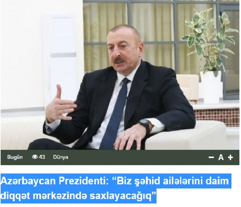 “Social security of the families of martyrs is improving. The amount of benefits provided to them is regularly increased. We will always keep them in the spotlight. The Ministry of Labor and Social Protection of the Population has been instructed to provide jobs for this category of people, especially after the second Karabakh war. This process has already begun,” the head of state said.