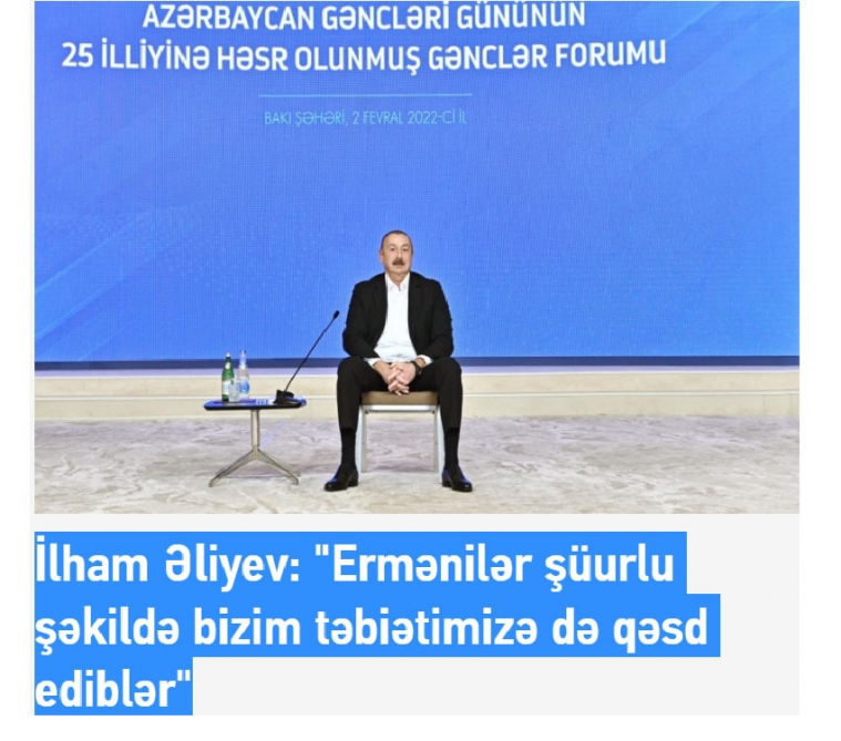 Tbilisi, February 4, AZERTAC President Ilham Aliyev`s speech at the Youth Forum dedicated to the 25th anniversary of the Day of Azerbaijani Youth has been in the focus of the Georgian media. 24news.ge, interpress.ge and aktual.ge news portals posted articles highlighting the speech of the Azerbaijani President. The articles draw readers’ attention to Azerbaijani President’s remarks regarding Armenia’s deliberately destroying the nature, flora and fauna of Azerbaijan, the evidences testifying that Shusha is an Azerbaijani city, as well as the Azerbaijanis studying abroad.