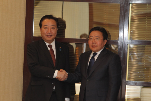 Ulaanbaatar, Mongolia /MONTSAME/ The President of Mongolia Ts.Elbegdorj received on Tuesday Mr. Yoshihiko Noda, the Prime Minister of Japan, during the general debate of the 67th session of the UN General Assembly in New York city, USA. The State Head expressed satisfaction with a development of the Mongolia-Japan relations within the strategic partnership principle, and thanked Japan's side for rendering a support for Mongolia. Tuen he briefed on present socio-economic situation of Mongolia. "Developing the relations and cooperation with Japan is one of the priorities of Mongolia's foreign policy, our state gives a great importance to the ties with Japan," Elbegdorj noted. He congratulated the Premier of Japan on the 40th anniversary of the bilateral diplomatic relations and invited him to Mongolia with a visit. He asked the Japanese PM to help in augmenting a quota of Mongolian students studying in Japan. In response, Mr Noda congratulated the President on forming the new cabinet and parliament after successful parliamentary electiona, and wished Mongolia big successes. He noted that a speech the leader of Mongolia had delivered at Japan's parliament has brought a big achievement in the Mongolia-Japan relations. Mr Noda said their side has really appreciated an upcoming visit of the Mongolian Foreign Minister to Japan, hoping that it will significantly contribute to the relations. "We fully support the Japanese investments to Mongolia," he added. Mr Noda also congratulated the President on the brilliant success of Mongolian wrestlers of professional sumo. The dignitaries also shared views on the situation of East Asia, and discussed a collaboration within the United Nations. The President asked Mr Noda to pass his warm regards to His Imperial Majesty Akihito and expressed satisfaction with starting of talks on establishing an economic cooperation. B.Khuder