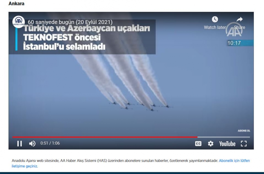 Fighter jets of the Turkish and Azerbaijani air forces put on a dazzling air show over Istanbul’s Bosphorus Strait on Monday, ahead of the opening ceremony of Turkey’s biggest aerospace and technology festival Teknofest, according to Anadolu Agency.