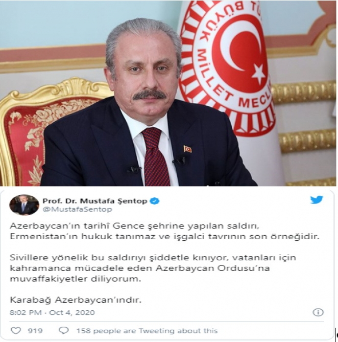 Baku, October 5, AZERTAC The Turkish parliament's speaker on Sunday condemned Armenia's shelling in Azerbaijan's second largest city of Ganja, according to Anadolu Agency. "The attack in Azerbaijan's historical city of Ganja is the latest example of Armenia's unlawful and occupant attitude," Mustafa Sentop tweeted. "I condemn this attack towards civilians, I wish success to the Azerbaijani army that is fighting for their country heroically." Occupied Karabakh belongs to Azerbaijan, he added.