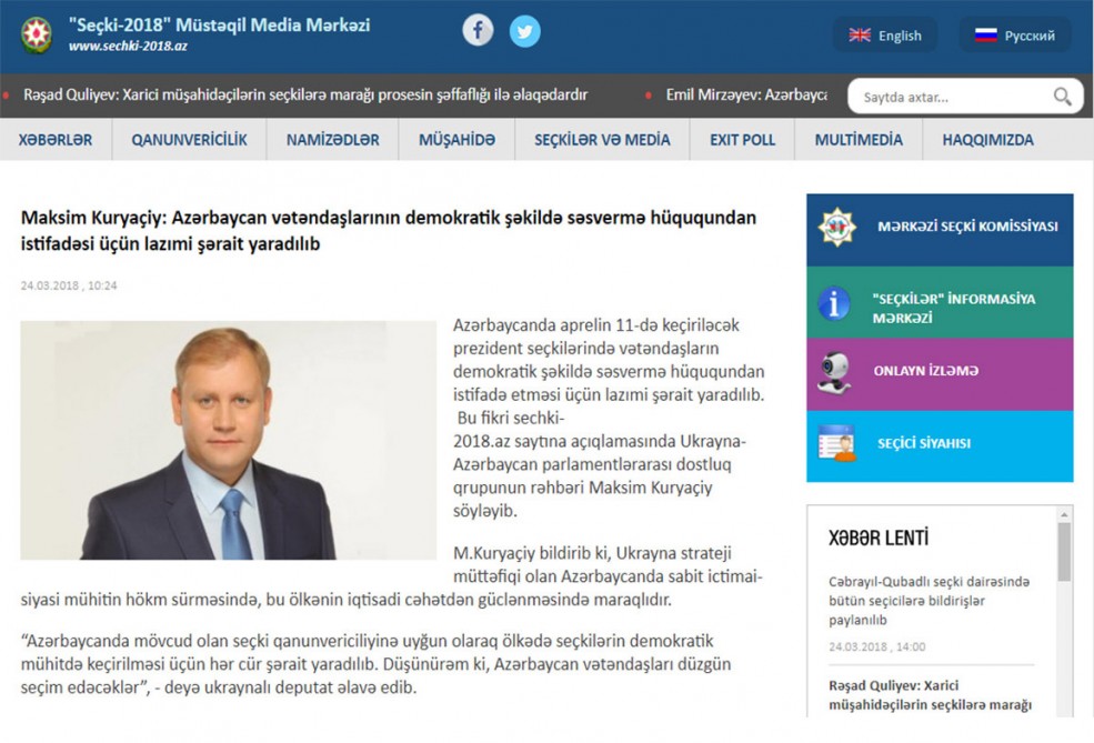 “All the necessary conditions were provided for Azerbaijani citizens to exercise their right to vote in the presidential elections to be held in Azerbaijan on April 11,” head of the Ukraine-Azerbaijan inter-parliamentary friendship group Maksim Kuryachiy has told “sechki-2018.az” website.