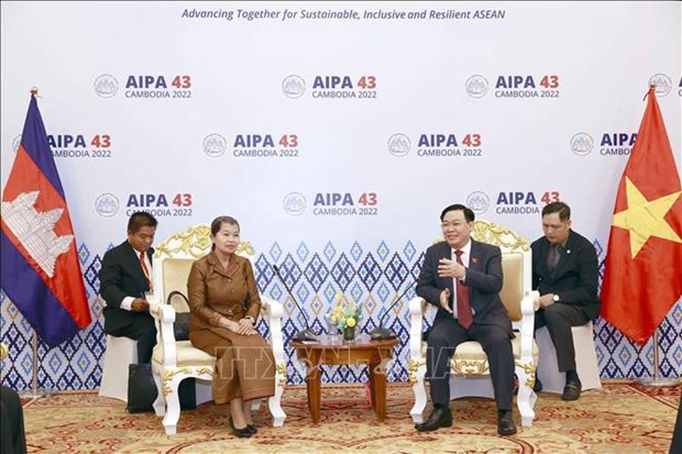 Phnom Penh, November 21 (VNA) – National Assembly Chairman Vuong Dinh Hue and Cambodian Deputy Prime Minister Men Sam An on November 20 agreed on the need for the two countries to bolster cooperation in all channels, including collaboration between their legislatures and localities sharing the border line. During their meeting in Phnom Penh, Hue and Men Sam An consented to intensify people-to-people exchange in pragmatic, effective forms such as through activities of the Vietnam-Cambodia and Cambodia-Vietnam Friendship Associations and Friendship Parliamentarians Groups. They shared the view that such move will raise the awareness of the two countries’ young generations about the importance of the good neighbourliness, traditional friendship, and comprehensive, sustainable and long-term cooperation between the two countries. Hue noted with pleasure the strong development of Cambodia in general and Phnom Penh in particular, which he believes and expressed will create a firm foundation for the country to gain even more success in national construction and development. The top legislator spoke highly of the role of Men Sam An as President of the Cambodia-Vietnam Friendship Association and the association as well in promoting people-to-people diplomacy, cultural exchange, solidarity, friendship and good neighbourliness between the two Governments and peoples. He suggested Men Sam An, who is also Vice President of the Cambodian People's Party, further support Vietnamese citizens and businesses as well as Cambodians of Vietnamese origin in the country. The Cambodian Deputy PM stressed that the first official visit to Cambodia by the NA Chairman is of significance as it not only contributes to consolidating the friendship neighbourliness and comprehensive cooperation between the two countries, but also demonstrates Vietnam’s strong support to Cambodia as Chair of the Association of Southeast Asian Nations (ASEAN) in 2022 and the 43rd ASEAN Inter-Parliamentary Assembly (AIPA) General Assembly. She congratulated Vietnam over its great, comprehensive achievements in national construction, development and international integration, and thanked the Vietnamese Party, State and people for their wholehearted support to Cambodia, helping the country escape from the genocidal regime. Host and guest expressed their pleasure at the active development of the friendship neighbourliness and comprehensive cooperation between Vietnam and Cambodia over the past time, especially joint efforts in organising activities celebrating their friendship year 2022. Hue is in Cambodia for an official visit to Cambodia and attendance in AIPA-43.- VNA