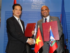 HANOI, 31 March (VNA) - Vietnam and Haiti have issued a joint statement on the occasion of Prime Minister Nguyen Tan Dung’s visit from March 28-29, in which they agreed on their major future cooperation directions in various fields. The two sides reached consensus on the importance of further expanding their areas of cooperation, contributing to improving the living conditions for both peoples and fueling socio-economic development. Vietnam and Haiti will work harder together to speed up the signing of agreements, aiming to create a proper legal framework for the sustainable development of their all-round ties, said the statement. Additionally, the two countries will exert efforts to implement the Memorandum of Understanding on energy cooperation reached between Vietnam ’s Ministry of Industry and Trade and Haiti ’s Office of Minister Delegate for Energy Security, while stepping up negotiations for other agreements on cultural affiliation and investment encouragement, it said. The two sides will also bolster their partnership in other areas, including agriculture and food security, telecommunications, energy, trade, infrastructure building and investment for mutual benefit, said the statement. Vietnam and Haiti will create favourable conditions for joint cultural activities, while working closely to make travelling to each other country easier, so that citizens of the two nations can become closer, it added. The two countries will also share ideas and support each other during discussions at international forums on matters of mutual concern. In the document, the two sides also underscored the importance of fostering the South-South Cooperation framework to the enhancement of living conditions for the people of involved countries.-VNA