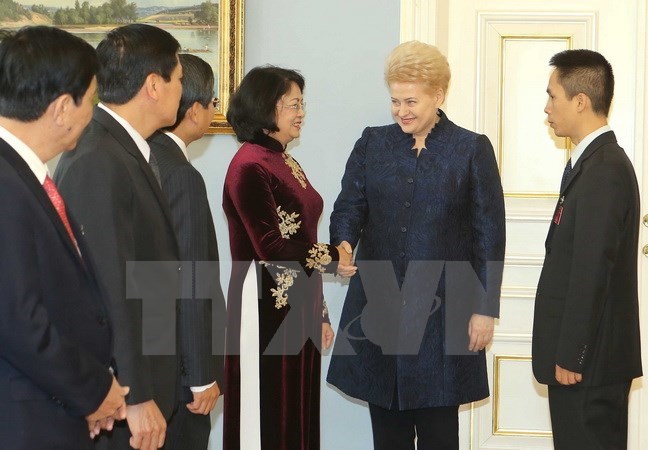 Vilnius, October 24 (VNA) – Vice President Dang Thi Ngoc Thinh and President of Lithuania Dalia Grybauskaite pledged to reinforce bilateral cooperation, especially in the economy, trade and investment, during their talks in Vilnius city on October 23 (local time). The Vietnamese leader, who is in Lithuania from October 22-24, spoke highly of close coordination between the two countries at multilateral mechanisms such as the United Nations, the UNESCO and the Asia-Europe Meeting over the past years. She asked Lithuania to support Vietnam’s bid to strengthen ties with the European Union (EU) and push forward the early signing and ratification of the EU-Vietnam Free Trade Agreement (EVFTA). Thinh proposed that Lithuania continues creating favourable conditions for the Vietnamese community living in the country. Grybauskaite, for her part, suggested cooperating together in the fields of renewable industry, innovation, energy, waste treatment and wood processing and continuing to work closely together at multilateral forums. The two leaders agreed to promptly negotiate and sign agreements on economic and education cooperation, double taxation avoidance, visa waiver for diplomatic passport holders, thus creating a synchronous legal framework for bilateral multifaceted collaboration in the near future. Meeting Speaker of the Seimas (parliament) of Lithuania Viktoras Pranckietis, Thinh said the Vietnamese government is working to improve business climate to attract foreign investors and hoped that more Lithuanian firms will be keen on doing business in Vietnam. She sought the host country’s support for Vietnamese agro-fisheries to enter its market, adding that Vietnam will make it easier for goods of Lithuania’s strength to navigate the market. Pranckietis wished to increase the exchange of delegations between the two countries as well as economic-trade and investment ties with Vietnam, focusing on food and information technology, wooden furniture, education-training, people-to-people exchange and tourism. He expressed his appreciation for ASEAN-EU ties, and support to Vietnam-EU relations, including the signing and ratification of EVFTA, believing that the deal will bring economic-trade-investment benefits to the both sides./.