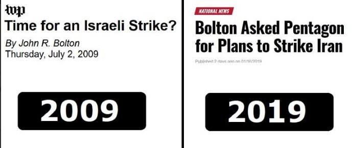 “Same bull. Same bully. Same delusion,” wrote Iranian Foreign Minister Mohammad Javad Zarif in a tweet on Friday, followed by an attached image of two pictures together. One, a screenshot of an Op-Ed written by John Bolton back in 2009, with the title, ‘Time for an Israeli Strike?’ in which he had argued for military force against Tehran to be carried out by the Israeli regime, and the other, another screenshot of a report posted on 16th January 2019, with the headline reading ‘Bolton Asked Pentagon for Plans to Strike Iran.’