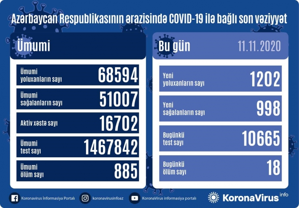 Baku, November 11, AZERTAC 1202 new cases of coronavirus infection have been recorded in Azerbaijan, while 998 patients have been recovered and discharged from the hospital, the Task Force under the Cabinet of Ministers told AZERTAC. According to the Task Force, 18 persons have died after testing positive for COVID-19. “The overall confirmed cases in Azerbaijan have reached 68,594 with 51,007 recoveries and 885 deaths, while treatment of 16,702 others is underway. A total of 1,467,842 coronavirus tests have been conducted in the country so far," the Task Force added.