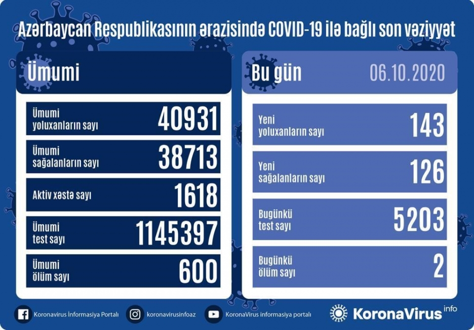 Baku, October 7, AZERTAC The number of COVID-19 cases in Azerbaijan over the past day has risen by 143, reaching 40,931, the Task Force under the Cabinet of Ministers told AZERTAC. “As many as 126 people were discharged from hospitals in the past 24 hours, bringing the total number of recoveries to 38,713. Two coronavirus patients died in the past 24 hours, taking the death toll to 600," the Task Force said. “Azerbaijan conducted 5,203 tests for coronavirus in the last 24 hours, bringing the overall number of tests carried out so far to 1,145,397," the Task Force added.