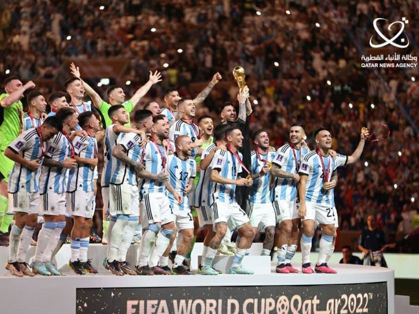 Doha, December 18 (QNA) - Argentina won the FIFA World Cup Qatar 2022 following a 4-2 victory on penalties after the 120-minute game ended in a 3-3 draw at Lusail Stadium on Sunday. Lionel Messi opened the scoring for Argentina in the 23rd minute. Angel Di Maria added the second for Albiceleste in the 36th minute. In the second half, Kylian Mbappe scored a brace in the 80th minute -from the penalty spot, and 81st minute to level the game for France. In the extra-time, Messi netted the third goal for Argentina in the 109th minute. But, Mbappe leveled the game again from the penalty spot in the 118th minute. Argentina's goalkeeper Emiliano Martinez saved a penalty from Kingsley Coman and France's Aurelien Tchouameni penalty went out of wide as Argentina won the shoot-outs 4-2 to capture the World Cup trophy. (QNA)