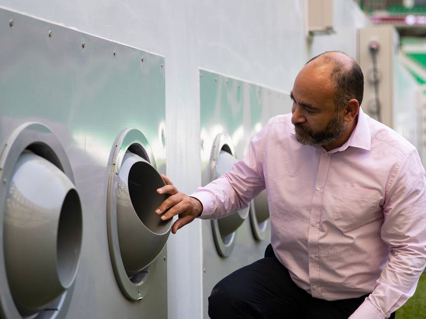 Engineer of stadiums cooling technology for FIFA World Cup Qatar 2022 Dr. Saud Abdul Ghani emphasized that his study to have the PhD degree addressed the ventilation process in vehicles, and from there his project was launched to create a cooling technology system in the seven stadiums based on the design dedicated to each stadium, adding that solar energy is utilized in generating the essential power to cool the air by pulling it to the stadium followed by a vacuum process to intake the cooled air to be further cooled and filtrated and ultimately be brought to the direction of fans and footballers in the stadium by creating orifices on the ground sides of the stadium and underneath the fans seats.