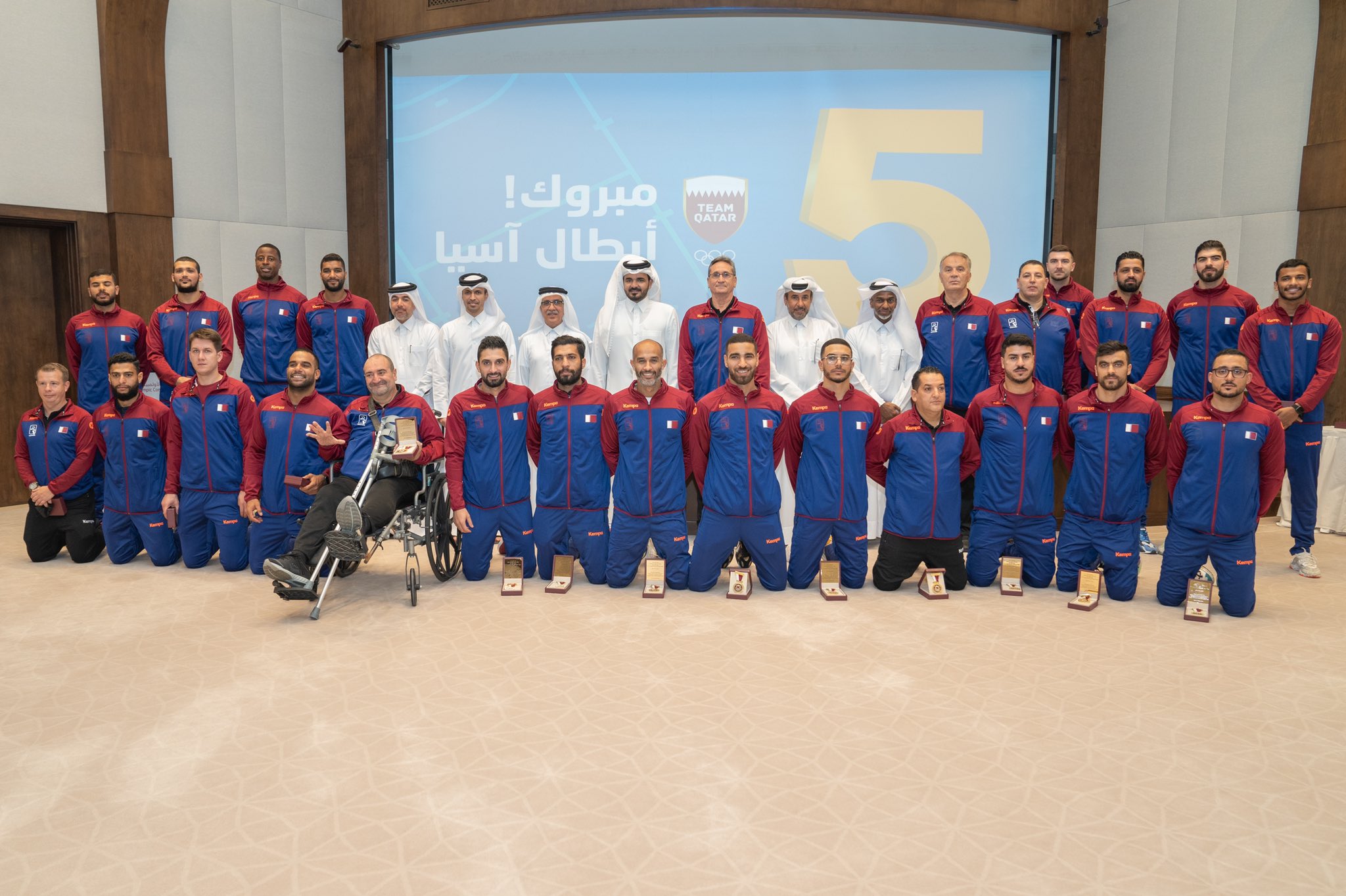 Doha, February 16 (QNA) - HE President of Qatar Olympic Committee (QOC) Sheikh Joaan bin Hamad Al-Thani, honored today the Qatari handball team after winning the 5th consecutive title in the 20th Asian Mens Championship which was held lately in the Eastern Province of the Kingdom of Saudi Arabia, and their qualification for the World Championship Poland - Sweden 2023.