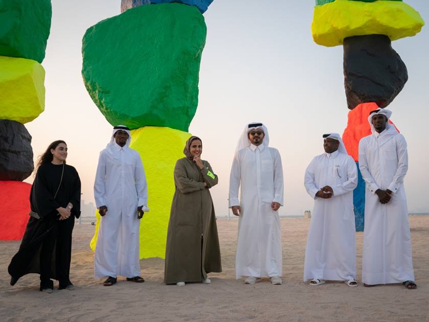 Doha, October 22 (QNA) - In the presence of HE Qatar Olympic Committee (QOC) President Sheikh Joaan bin Hamad Al-Thani, HE Chairperson of Qatar Museums Sheikha Al Mayassa bint Hamad Al-Thani inaugurated on Saturday the public art installation "Doha Mountains" by Swiss artist Ugo Rondinone at the Ras Abou Aboud beachfront, near the 974 Stadium.