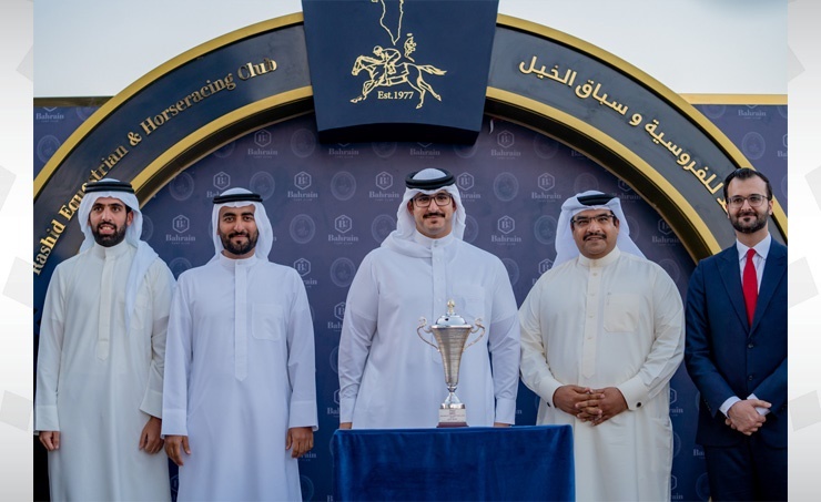 HH Shaikh Isa bin Salman bin Hamad Al Khalifa was presented with the trophy of the GPIC Cup by Plant Operations Manager at GPIC, Khalid Yousif Al-Binali, following the success of “Cloud Drift”, from the “Gunners Racing” stable, in winning the ninth round.