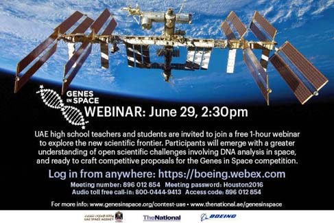 ABU DHABI, 29th June, 2016 (WAM) -- The National newspaper is organising a webinar, or web-based seminar, for students, teachers and other parties involved in the ‘Genes in Space’ competition, part of the National Space Programme, on Wednesday. The event aims to help participants develop competitive presentations by identifying the challenges facing DNA analysis in outer space.