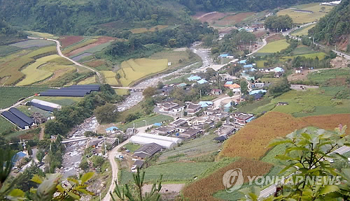 This is a bird's eye view of Handmi Village in Danyang, 193 km southeast of Seoul. The village was certified as an eco-village by German-based TUV Rheinland, a global provider of certification services, on March 19, 2013. (Photo courtesy of Handmi) (Yonhap)
